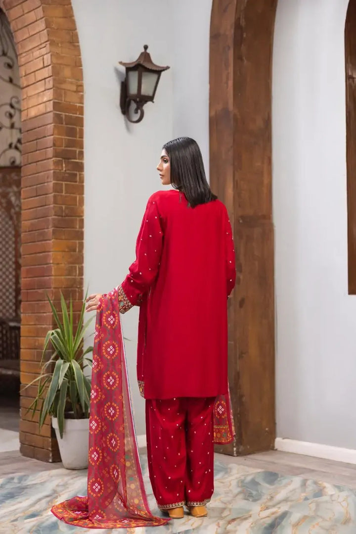 Radiate elegance with HL-605, a luxurious 3-piece embroidered viscose suit from the Hamayun Abbottabad Winter Festive Collection. The deep ruby red hue symbolizes grace and celebration, enhanced with intricate multicolor embroidery on the neckline and sleeves.